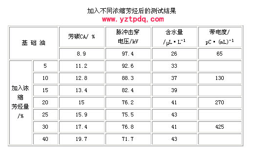 (1) 降低了油的沖擊擊穿強(qiáng)度。工頻擊穿電壓與脈沖擊穿電壓影響因素不同,工頻擊穿電壓值主要受水分、雜質(zhì)等影響,可以通過油處理得到提高;脈沖擊穿強(qiáng)度主要受油組分影響,油中含雜環(huán)芳烴和膠質(zhì)多時(shí),擊穿電壓下降明顯。變壓器,特別是超高壓變壓器,在試驗(yàn)和運(yùn)行中都會(huì)遇到不同波形和幅值的沖擊電壓,提高油的耐沖擊強(qiáng)度是有實(shí)用意義的。表2為原克煉基礎(chǔ)油加入不同量的濃縮芳烴后,脈沖擊穿電壓值隨增加量的變化。