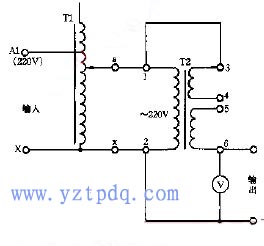 眾所周知,普通的交流接觸式調(diào)壓器的調(diào)壓范圍,均是在0~250V之間,因輸入電壓為220V,所以最大的輸出電壓僅比輸入電壓高30V。若按圖所示,用一臺交流接觸式調(diào)壓器T1和一只初級220V,次級為雙30V的電源變壓器T2(要求T2功率大于用電器具的功率)串聯(lián)使用,則可實現(xiàn)輸出電壓比輸入電壓提高90V。