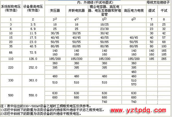 各類設(shè)備短時(1min)工頻耐受電壓(有效值)表