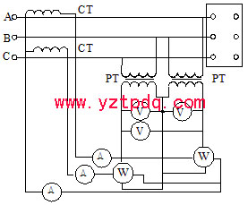 對于單相電力變壓器,可采用圖1-1所示的接線進行空載試驗。對于三相電力變壓器,可采用圖1-2和圖1-3所示的兩瓦特表法進行空載試驗。圖1-2為直接測量法,適用于額定電壓和電流較小,用電壓表和電流表即可直接進行測量的電力變壓器。當(dāng)電力變壓器額定電壓和電流較大時,必須借助電壓互感器和電流互感器進行間接測量,此時采用圖1-3接線方式。