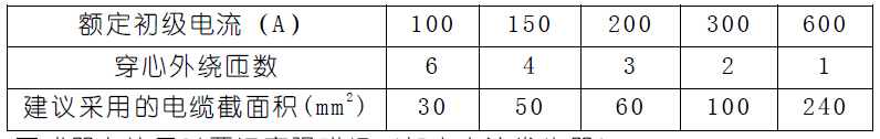 3、初級電流為100A~600A時(shí),初級繞組穿心匝數(shù)和導(dǎo)線截面積按下表選擇: