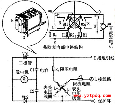 與搖表表針相連的有兩個線圈,一個同表內(nèi)的附加電阻R串聯(lián);另一個和被測電阻R串聯(lián),然后一起接到手搖發(fā)電機上。當手搖動發(fā)電機時,兩個線圈中同時有電流通過,在兩個線圈上產(chǎn)生方向相反的轉(zhuǎn)矩,表針就隨著兩個轉(zhuǎn)矩的合成轉(zhuǎn)矩的大小而偏轉(zhuǎn)某一角度,這個偏轉(zhuǎn)角度決定于兩個電流的比值,附加電阻是不變的,所以電流值僅取決于待測電阻的大小。