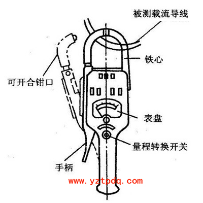 鉗形電流表主要是由電流互感線圈與萬用表組成,利用互感線圈產(chǎn)生的感應(yīng)電流通過萬用表讀出,如圖所示。