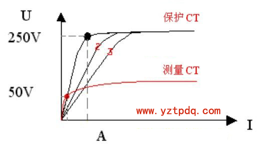2、測得的伏安特性曲線與過去或出廠的伏安特性曲線比較,電壓不應(yīng)有顯著降低。若有顯著降低,應(yīng)檢查二次繞組是否存在匝間短路。當(dāng)有匝間短路時,其曲線開始部分電流較正常的略低,如圖中曲線 2、3 所示(指保護(hù) CT 有匝間短路,曲線 2 為短路 1 匝,曲線 3 為短路 2 匝),因此,在進(jìn)行測試時,在開始部分應(yīng)多測幾點(diǎn)。